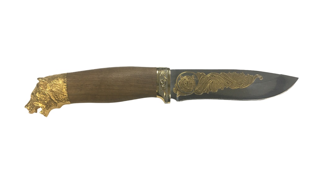 Нож ЗЗОСС Н6 сталь ЭИ-107 рук. золото, литье,орех, рисованный клинок в золоте