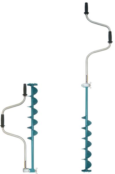 Основное и единственное отличие двуручных ледобуров от классических – верхняя рукоятка ледобура смещена относительно оси ледобура на 130 мм, а нижняя на 150 мм. Такое расположение рукояток позволяет вращать ледобур одновременно двумя руками, тем самым, увеличивая скорость бурения лунок во льду. Кроме того, существенно уменьшаются габариты ледобура в транспортном положении. По всем остальным характеристикам двуручные ледобуры полностью соответствуют классическим.