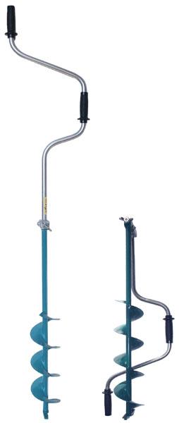Основное и единственное отличие двуручных ледобуров от классических – верхняя рукоятка ледобура смещена относительно оси ледобура на 130 мм, а нижняя на 150 мм. Такое расположение рукояток позволяет вращать ледобур одновременно двумя руками, тем самым, увеличивая скорость бурения лунок во льду. Кроме того, существенно уменьшаются габариты ледобура в транспортном положении. По всем остальным характеристикам двуручные ледобуры полностью соответствуют классическим.