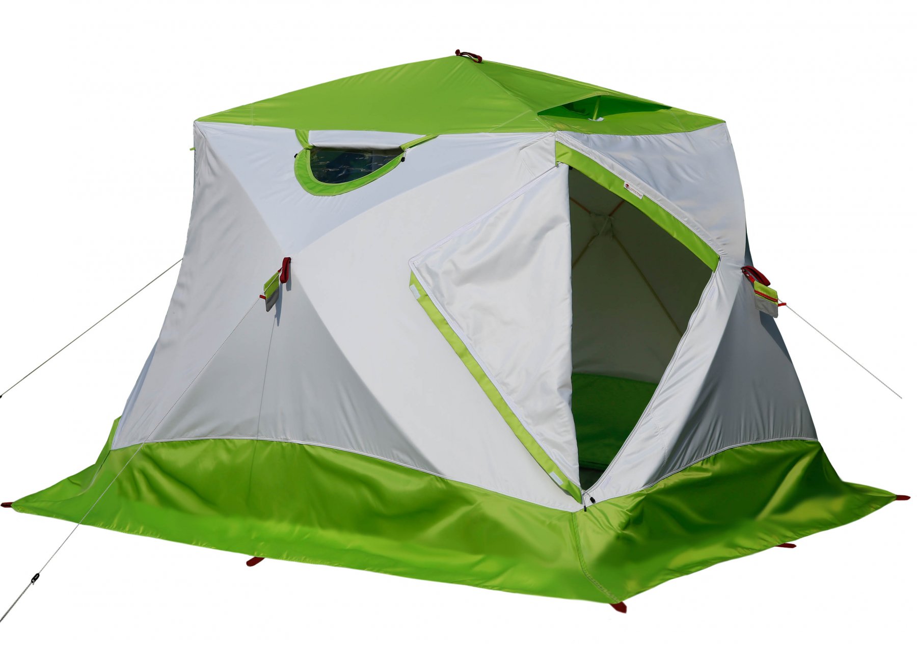 Универсальная система креплений внешних съемных элементов в оконных проемах палатки позволяет устанавливать в них: прозрачное окно, клапан под теплообменник, огнеупорный клапан, противомоскитную сетку (опция);