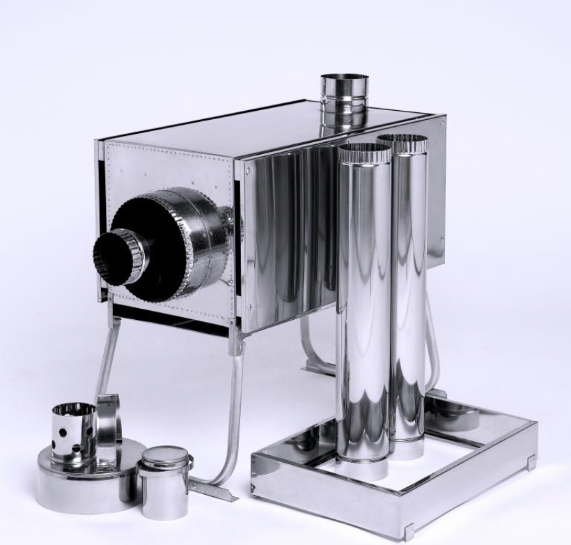 Ножки складные, устойчивые, изготовлены из легкого алюминия. Колена трубы диаметром 80 мм вставляются друг в друга таким образом, чтобы нагар и конденсат оставались внутри и не проникали наружу через стыки. При транспортировке колена умещаются внутрь печи.